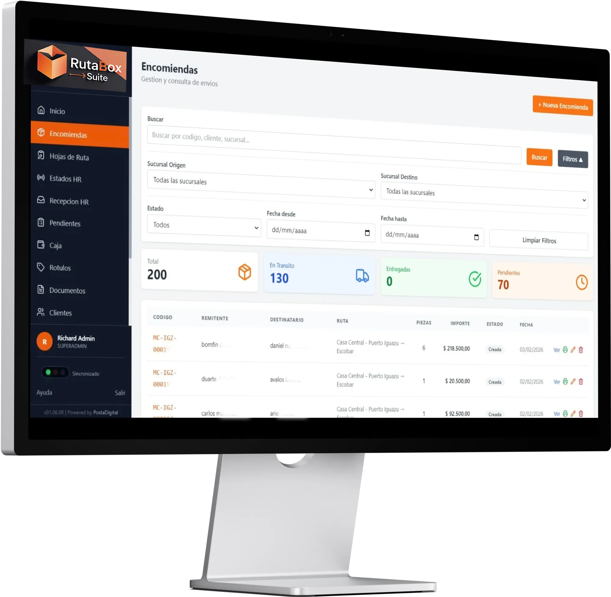 Desde la recepción del paquete hasta la entrega al destinatario. Tracking GPS en tiempo real, hojas de ruta, facturación y más. Todo en una sola plataforma.